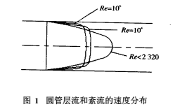 不同流動(dòng)狀態(tài)的水泥漿液流經(jīng)流量計(jì)測(cè)量管時(shí),管內(nèi)圓截面上會(huì)呈現(xiàn)不同的流速分布(見圖1),即: 層流的流速變化是拋物線分布,在管中心軸上流速*大,且雷諾數(shù)變化、流速分布形態(tài)不變;紊流時(shí),流速分布在測(cè)量管內(nèi)壁的近旁比層流流速大,在中心部比層流時(shí)流速小,且流速分布形態(tài)隨雷諾數(shù)的變化而變化。