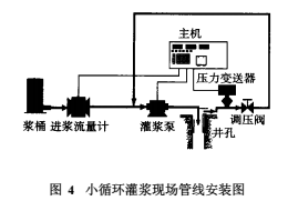 小循環(huán)灌漿法的實(shí)質(zhì)是: a泵的吸入量主要由返漿量提供,返漿量的大小由高壓調(diào)節(jié)閥控制,鉆孔灌漿注入量=流量計(jì)量(見圖4);b流量計(jì)大部分時(shí)間工作在1/3量程之下,相當(dāng)長(zhǎng)的時(shí)間內(nèi)工作在1L/min左右;c返漿漿液不返回?cái)嚌{桶,水泥漿液只能在閉合的管道中循環(huán),漿桶內(nèi)調(diào)節(jié)水灰比對(duì)灌漿漿液的密度影響甚微。
