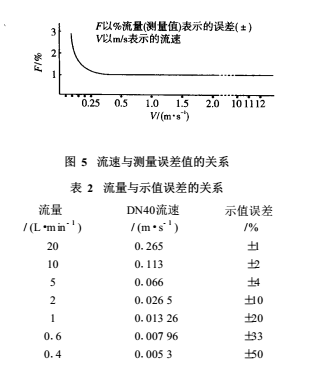 由EMF的測(cè)量原理可知,其流量的下限由同噪聲或偏移的信噪比S/N 來(lái)決定,其上限則由測(cè)量管內(nèi)襯里的磨損和配管的經(jīng)濟(jì)速度等來(lái)決定。一般當(dāng)測(cè)量管內(nèi)實(shí)際流速小于0.1m/s時(shí),感應(yīng)電動(dòng)勢(shì)已變得十分微弱(幾微伏至零點(diǎn)幾微伏),此時(shí)噪聲的影響逐步變?yōu)橹鲗?dǎo),甚至淹沒(méi)信號(hào)電動(dòng)勢(shì)。其流速和測(cè)量誤差的關(guān)系詳見圖 5和表2。