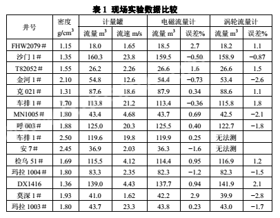 現場試驗所用測量管的內徑為DN50,通過高壓由壬接入泥漿管線,并串接渦輪流量計進行比較,采用標準計量罐測試。計量鉆井泥漿密度范圍為1.15g/cm³~2.50g/cm³,固井設計施工現場一次性替漿量為18m³~160m³,替漿瞬時流量為0.2m³/min~2.8m³/min(流速:1.6~23.8m/s);通過近15口井的施工應用,結果如表1所示。試驗表明儀表計量誤差小于1%;在流速2.0m/s以下,隨著流量的減少測試誤差逐漸提高,在流速1.0m/s左右計量精度降到3%左右。經分析,主要是由零點漂移引起的,這點與實驗室用清水標定結果基本吻合。使用DN50的測量管,實驗室標定結果如表2所示。試驗證明,采用雙頻矩形波作為勵磁信號,可有效地規避和抑止固井泥漿的流動噪聲和現場震動等所帶來的低頻噪聲,從而顯著提高儀表計量泥漿的精度。
