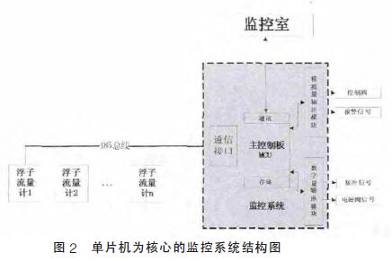浮子流量計(jì)監(jiān)控系統(tǒng)主要功能是模擬量采集輸出, 數(shù)字量采集輸出,由核心模塊進(jìn)行分析、處理、存儲并和上位機(jī)通信。工業(yè)上常用的監(jiān)控系統(tǒng),從組成結(jié)構(gòu)來看主要分為PLC為核心的監(jiān)控系統(tǒng)、現(xiàn)場總線為核心的監(jiān)控系統(tǒng)、單片機(jī)為核心的監(jiān)控系統(tǒng)。本設(shè)計(jì)主要采用以單片機(jī)為核心的監(jiān)控方法,該系統(tǒng)使用廣泛,體積小、功耗低、操作方便、設(shè)計(jì)簡便、成本低,是許多小型監(jiān)控系統(tǒng)的*選。單片機(jī)為核心的監(jiān)控系統(tǒng)結(jié)構(gòu)如圖2所示。本監(jiān)測系統(tǒng)主要包括現(xiàn)場浮子流量計(jì)組、485總線、主控制板MCU 以及模擬數(shù)字輸出控制模塊。
