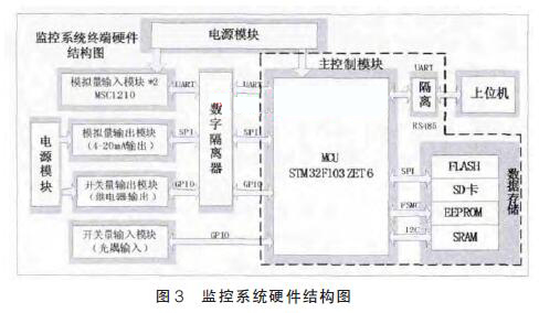 現(xiàn)場浮子流量計(jì)監(jiān)控系統(tǒng)的總體結(jié)構(gòu)如圖2所示。其中硬件系統(tǒng)主要功能是模擬量(溫度、儀表信號)的采集,模擬量(4~20mA 電流)的輸出,開關(guān)量的輸入輸出以及遠(yuǎn)距離RS485串行通訊和數(shù)據(jù)存儲。其中監(jiān)測系統(tǒng)硬件結(jié)構(gòu)如圖3 所示。為增強(qiáng)監(jiān)測系統(tǒng)的抗干擾能力, 本設(shè)計(jì)采用帶隔離的電源模塊以及數(shù)字隔離器確保系統(tǒng)能夠高效穩(wěn)定工作。
