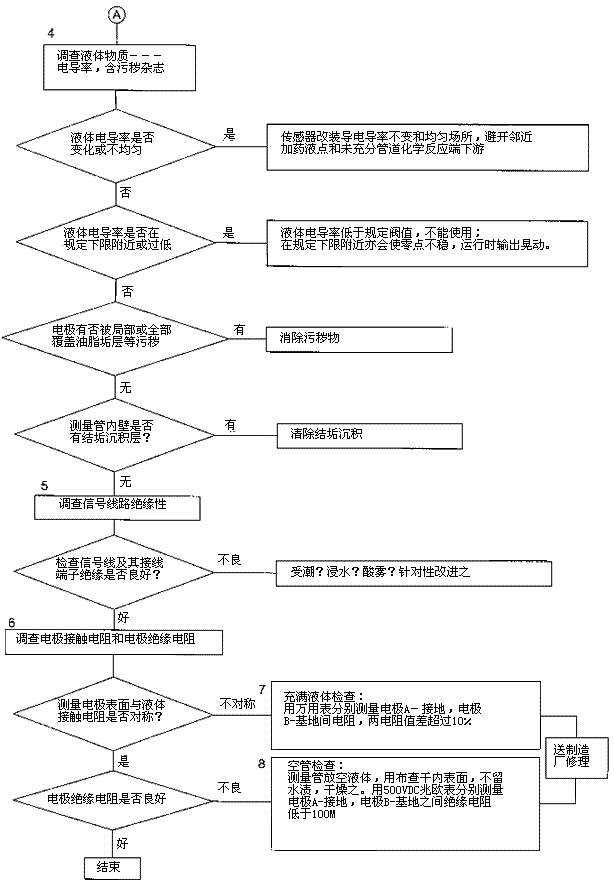 檢查流程圖*5項。信號回路絕緣下降會形成零點不穩(wěn)。信號回路絕緣下降的土要原因足,包極部位絕緣下降所引起的,但也不能排除信號電纜及其接線端子絕緣下降或破壞。因為有時候現(xiàn)場環(huán)境十分嚴酷,稍一疏忽儀表蓋、導線連接處密封不慎,彌漫著潮氣酸霧或粉粒塵埃侵入儀表接線盒或電纜保護層,使絕緣卜降。信號回路絕緣電阻檢查分別按電纜側和流量傳感器側兩郵分進行,用兆歐表測試。因信號電纜容易可先做。流量傳感器再分兩次進行:充滿液體測黽電極表面接觸電阻和個管后測量,U極絕緣電阻。