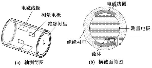 電容式冷卻塔冷卻水流量計(jì)從根本上解決了電極表面附著、腐蝕、摩擦等問(wèn)題,其電極與被測(cè)流體間有絕緣襯里隔離,或者直接采用絕緣測(cè)量管。電極置于測(cè)量管外面或鑲嵌于測(cè)量管內(nèi)部。嵌人式冷卻塔冷卻水流量計(jì)和外貼式冷卻塔冷卻水流量計(jì)的結(jié)構(gòu)如圖2所示。