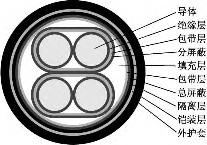 該新型電纜的結構如圖1所示。導體為單股退火鍍錫軟銅線,以提高導體的導電性和防腐蝕性。在導體外繞包一層?。疲矗ň鬯姆蚁┌雽щ妿?,有利于降低導體和絕緣之間的摩擦起電噪音。絕緣采用材料較為純凈、介電常數較小、具有一定彈性的聚丙烯絕緣級材料,并采用擠壓式擠出,減小絕緣層與導體的間隙。采用對絞組作為信號傳輸線,由于在兩根傳輸線上感應的電壓接近相等,減小了電壓差值,提高了信號傳輸穩定性;對絞組由兩種不同顏色絕緣線芯組成,相鄰線對對絞節距應不大于100mm。對絞分屏蔽組(即對對絞組進行分屏蔽,每對對絞組外繞包兩層聚酯帶和一層厚0.04mm鋁塑復合帶繞包,內置一根7×0.26mm鍍錫銅絞線作引流線)有利于對不同對絞組之間信號串音的抑制和隔離。對絞分屏蔽組同心式絞合成纜,在對絞分屏蔽組間填充非吸濕性材料,以保證纜芯圓整。在成纜纜芯外繞包兩層聚酯帶,再采用鋁塑復合帶繞包,內置鍍錫銅線作引流線,以提高電纜電磁屏蔽能力??偲帘螌油鈹D包隔離層(隔離護套),隔離層采用絕緣級低密度聚乙烯材料。隔離層外采用鎧裝層,鎧裝材料為高導磁合金鋼帶,其為強磁材料,可將外來的磁通大部分限制在鎧裝層的外表面上(僅有少部分能進入被屏蔽的空間);鎧裝時對高導磁合金鋼帶采用縱包焊接,確保其形成一連續圓柱管;鎧裝層可提高電纜抗電磁干擾水平以及對電纜進行加強,減少電纜振動引起的電動勢。外護套采用藍色軟PVC(聚氯乙烯)護層級電纜材料擠包,實現電纜防護。