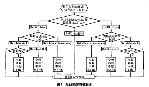實際生產中流量一直在某個區域內波動,且其動態特性不易掌握。從上面的理論中我們能夠讓誤差△£盡可能的小,這樣距我們所需要的理論值%就越接近。而減小誤差需要我們把n取的盡可能大,也就是在生產時間內劃分更多的周期去調節流量。當工控機根據測模具水流量計傳送回來的信號發出調節變頻器工作頻率的指令后,電機調整功率到測模具水流量計的實際測量為一個工作周期,我們知道從指令發送到實際測量值返回有一個較大的滯后,如果調節的周期時間小于流量計本身的一個工作周期,那么顯然不可能達到減小誤差的目的。利用模糊控制思想H。,在控制程序中我們把流量的波動區域劃分為±缸×Yo,Yo-t-O.3,Yo±0.5四個區域,其中缸為可調節的誤差范圍,生產中我們取0.015,流量區域劃分的單位均為t/h。針對不同的區域采取不同的調整方案。具體流程如圖3所示。圖中變量Rel表示實際測量的流量,變量Idea表示理論流量。