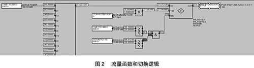 但是由于近期趨勢可能收集不到部分負(fù)荷段的相關(guān)數(shù)據(jù),在超出現(xiàn)有數(shù)據(jù)負(fù)荷的部分應(yīng)采取必要的補(bǔ)救措施,可以參考相同負(fù)荷運行的另一臺余熱鍋爐的主蒸汽流量,以此來彌補(bǔ)現(xiàn)有數(shù)據(jù)的不足。為了保證數(shù)據(jù)切換的可靠性,切換條件要嚴(yán)謹(jǐn),現(xiàn)有函數(shù)的負(fù)荷下線上增加25MW與另外一臺的燃機(jī)負(fù)荷大于100MW。如此設(shè)置的好處是當(dāng)另一臺運行機(jī)組突然故障或跳機(jī)時保證數(shù)據(jù)能及時切換到函數(shù)輸出,保證機(jī)組的安全運行。具體操作見圖2。