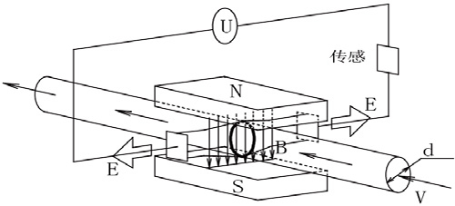 液體管道流量計主要由信號轉換器與傳感器構成,其原理是基于法拉利電磁感應定律,在其傳感器中與被測管軸線垂直方向安裝一對檢測電極,當其接入液態介質管道,導電液態物質沿管軸側運動時,導電液體作切割磁力線運動而產生感應電動勢,此感應電動勢由其兩個電極測出,其理論數值為:
