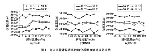 由圖1可得:( 1)隨著介質(zhì)溫度的升高,水處理流量計的儀表系數(shù)均呈逐漸降低的趨勢。其中20℃和50℃的儀表系數(shù)基本相同,10℃和80 0C的儀表系數(shù)與20℃時偏離較大。(2)溫度對水處理流量計的儀表系數(shù)在高溫以及低溫處影響明顯,以D N40水處理流量計為例,儀表系數(shù)本次實驗高低溫處*大變化量約為0. 7% o ( 3)在水處理流量計相應(yīng)的流量范圍內(nèi),在同一溫度下,隨著介質(zhì)流速的變化,水處理流量計的儀表系數(shù)在個別點出現(xiàn)略微浮動,但整體變化不超過1 0. 2 %。