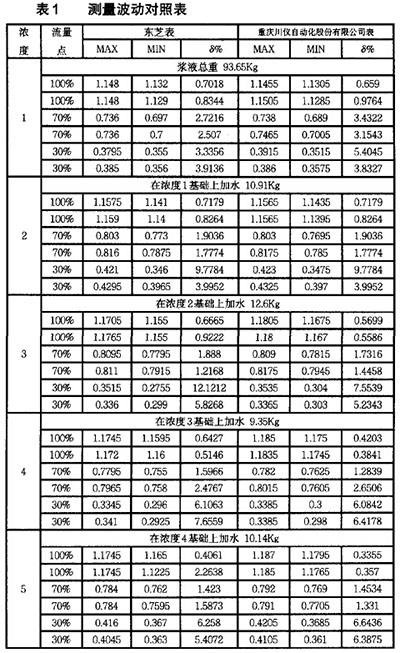 在造紙行業(yè)有大量的紙漿液體需要測(cè)量,就會(huì)用到大量的流量測(cè)量?jī)x表,目前在造紙行業(yè)中用于測(cè)量流量的儀表,主要有熱水管道流量計(jì)等儀表,因?yàn)?strong>熱水管道流量計(jì)具有非常強(qiáng)的優(yōu)點(diǎn),所以非常適合在紙漿的流量測(cè)量中使用。在紙漿實(shí)驗(yàn)裝置上,使用串聯(lián)在同一管道上該公司生產(chǎn)的漿液型熱水管道流量計(jì)與日本東芝的漿液型熱水管道流量計(jì)測(cè)量不同濃度和流量的紙漿漿液,以驗(yàn)證其可靠性。波動(dòng)率對(duì)比實(shí)驗(yàn)結(jié)果表明,該產(chǎn)品用于紙漿漿液測(cè)量時(shí)能夠很好地克服漿液噪聲。在滿(mǎn)流量測(cè)量時(shí),上述實(shí)驗(yàn)中各濃度下漿液測(cè)量穩(wěn)態(tài)波動(dòng)率均在1%以?xún)?nèi);其它流量下測(cè)量時(shí),由于實(shí)驗(yàn)系統(tǒng)主管道上游分流控制流速不穩(wěn),進(jìn)而導(dǎo)致測(cè)量穩(wěn)態(tài)波動(dòng)率相對(duì)較大,甚至達(dá)到近7‰ 但由表1可知,在各種漿液濃度及各流量點(diǎn)下,凱銘儀表有限公司生產(chǎn)的漿液型熱水管道流量計(jì)的穩(wěn)態(tài)波動(dòng)率始終與日本東芝漿液型熱水管道流量計(jì)的測(cè)量結(jié)果一致,從而表明實(shí)驗(yàn)系統(tǒng)的測(cè)量結(jié)果能準(zhǔn)確反映實(shí)際漿液流量大小。 說(shuō)明:MAX、MIN分別表示該組數(shù)據(jù)測(cè)得流速的的*大值和*小值,單位m/s。