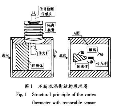 不斷流渦街同樣是以卡門渦街原理為依據測量流體流速的,但不斷流渦街表體已經在結構上有了質的改變。如圖1所示,它將普通渦街單一的信號檢測傳感頭改變為傳力桿與信號檢測傳感頭兩部分,并通過隔離裝置完全隔離。當表體中流過流體并產生漩渦時,由傳力桿檢測漩渦的變化,并以力的形式傳遞給信號檢測傳感頭,完成了力信號到電信號的轉換過程。雖然傳力桿與流體直接接觸,但其本身只是進行力傳輸的杠桿,因此,只對外形尺寸及鋼材選擇上具有要求。而信號檢測傳感頭是通過隔離裝置與流體完全密閉隔離的,再加上隔離裝置本身具有的散熱功能,使得信號檢測傳感頭的使用溫度要遠遠低于流體的實際溫度,從而有效地提高了普通信號檢測傳感頭的可測介質溫度。同時,不斷流渦街在進行維修更換信號檢測傳感頭時,并不影響工藝管道內流體的流動,真正實現了信號檢測傳感頭的不斷流拆裝維護。