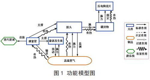 建立已有系統(tǒng)的功能模型(見圖 1)。通過功能模型分析,描述了系統(tǒng)元件及其之間的相互關(guān)系,并得出導(dǎo)致傳感器耐受溫度不足問題的功能因素:高溫蒸氣對(duì)測量管傳熱;測量管對(duì)探頭傳熱;探頭對(duì)灌封物傳熱;灌封物對(duì)壓電陶瓷片傳熱;高溫蒸氣對(duì)探頭傳熱。