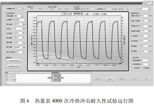 本文研究的 4000 次冷熱沖擊試驗的實現具有以下特點: (1)基于“工控機 +水泵 + 化工污水流量計”的閉環控制系統,實現了流量自動反饋調節,滿足試驗要求; (2)通過四個開關閥的時序切換,自動控制試驗溫度,很好的完成了 4000 次溫度沖擊試驗; (3)通過“工控機 + 數據數據采集卡”的數據采集系統,實時監控試驗過程中的流量、溫度、壓力等相關參數,實現試驗方式的自動控制,并能對試驗數據進行分析與評定。 (4)試驗的全過程為智能自動化,可無人員留守看護。試驗結果可直接反映出熱量表在長時間運行后的可靠性。為我國熱量表耐久性試驗研究提供檢測手段,為促進產品質量提升做好技術保障。