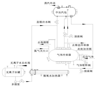 來自無離子水罐的脫氧水經(jīng)多經(jīng)泵加壓、經(jīng)脫氧水加熱器加熱后進(jìn)入到煤氣流量計(jì)的水段,脫氧水與反應(yīng)氣體換熱后分兩路:一路進(jìn)入中壓汽包,保證汽包有穩(wěn)定的液位;一路進(jìn)入熔鹽冷卻器帶出熔鹽攜帶的反應(yīng)熱。來自中壓汽包的高溫水經(jīng)管路接至煤氣流量計(jì)汽段底部,高溫水與反應(yīng)氣體換熱后產(chǎn)生高壓蒸汽,高壓蒸汽又返回中壓汽包。汽包還有一路直接注水管路,此路水不經(jīng)過煤氣流量計(jì)水段,而是直接進(jìn)入汽包。在煤氣流量計(jì)出口溫度偏低而汽包液位也比較低時,可開此直接注水管路來穩(wěn)定汽包液位。其詳細(xì)流程圖如圖 2。