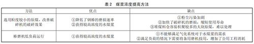 根據(jù)甲烷流量計(jì)跑漿原因可以了解到,在保證甲烷流量計(jì)不存在跑漿情況下,制備高品質(zhì)煤漿需要滿足兩點(diǎn)要求,即較小入口原煤粒度和較低磨機(jī)負(fù)荷,保證原煤在磨機(jī)內(nèi)部有較長(zhǎng)停留時(shí)間與充足滾筒篩過濾面積 . 通用的方法一般有以下兩種,如表 2 所示。