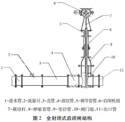 包括進(jìn)水管、直管、出水管、一氧化碳流量計(jì)組和啟閉機(jī)組,進(jìn)水管、直管、出水管從左到右依次連接,一氧化碳流量計(jì)組安裝在直管和出水管之間且位于出水管的入口處,一氧化碳流量計(jì)組通過聯(lián)結(jié)桿與啟閉機(jī)組的輸出端連接。為防止泥沙淤積影響啟閉,一氧化碳流量計(jì)采用閘板式啟閉結(jié)構(gòu)。密封式啟閉閘為整體封閉管道式,全部采用不銹鋼材料,水流通過管道流出讓整個閘井內(nèi)干燥無水。伸縮套管與波紋管的設(shè)計(jì)讓檢修與清理淤泥更加方便。一氧化碳流量計(jì)裝有荷載限制器,其布置受力明確、結(jié)構(gòu)緊湊、動作可靠。當(dāng)?shù)蹙呱系暮奢d達(dá)到額定值的 110%時,或電機(jī)電流超過額定電流 150%時,系統(tǒng)自動切斷操作電源以保護(hù)設(shè)備安全。