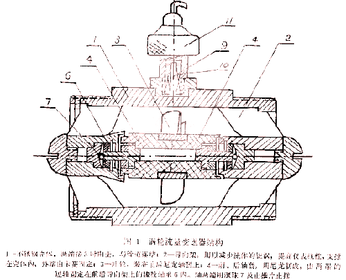 在固井過程使用重油流量計, 主要解決渦輪變送器的耐高壓、耐震以及高速下的耐磨蝕問題。在這方面, 我們采用了耐磨橡膠軸承 , 尼龍軸套, 單滾珠止推等措施, 基本上可以滿足施工要求。結(jié)構(gòu)主要由不銹鋼殼體、導向架、葉輪和前后軸套組成, 見上圖1。