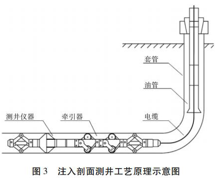 水平井注水井注入剖面測井工藝原理如圖 3 所示。在垂直井段,儀器在重力作用下可以通過注入管柱下入到井內,注入管柱下端須裝有喇叭口,且喇叭口應在造斜點以上,保證測井完成后儀器順利起出,不發生卡儀器問題。儀器通過喇叭口以后在重力作用下繼續向下移動,當儀器不能靠重力下移時,啟動牽引器,利用牽引器將儀器推送到井底,上提電纜過程中進行測井。