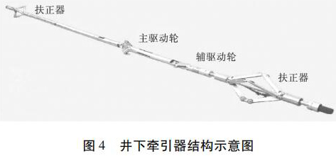 牽引器采用的是 Sondex 公司的牽引器,如圖 4所示。儀器外徑 54 mm,長度 7.4 m,牽引力 273 kg,耐壓103 MPa,耐溫 150 ℃,牽引速度 540 m/h。牽引器連接于電纜頭和測井儀器之間。在水平段和造斜段儀器不能靠自重下放,利用牽引器可以將儀器推送到測井目的層段。井下牽引器由兩組呈 90°交叉分布的驅動臂和扶正器組成。在進行井下儀器牽引時,*先打開牽引器驅動臂,使驅動臂端部的驅動輪支撐到套管壁并保持足夠的正壓力,然后驅動輪旋轉實現對儀器的推送。井下儀器牽引過程可在地面進行人工控制,通過控制命令和調整供電電壓可控制井下牽引速度和方向。該牽引器提供了多種井下測量參數,包括電纜頭電壓和張力、牽引速度、接箍深度等數據,所有這些沿井身測量到的參數均可在地面顯示出來,使施工具有安全性和可操作性。當斷開電源時,驅動臂在外力作用下可收回,保證儀器安全取出。