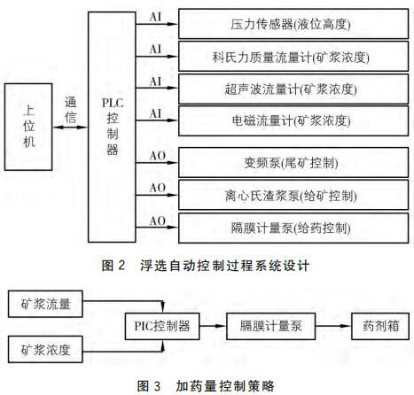 圖3中的礦漿流量與礦漿濃度分別由科氏質(zhì)量流量計和超聲波流量計測得,并 以4~20mA 電流信號傳送給 PLC控制器。由 PLC控制器根據(jù)電流信號值計算出實際的礦漿濃度和礦漿流量值,對上述兩個值進(jìn)行邏輯處理以及運算,得出實時加藥量。PLC 控制器將計算出的實時加藥量數(shù)據(jù)以4~20mA 的電流信號發(fā)送給隔膜計量泵,由其控制并實現(xiàn)加藥量過程的自動控制。