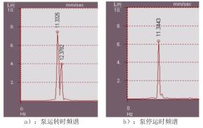 對振動采集器獲取的信號進(jìn)行譜分析,高溫液體流量計組運轉(zhuǎn)狀態(tài)下主要振動頻率為11.33Hz和12.38Hz,其中12.38Hz為高溫液體流量計轉(zhuǎn)動頻率;停運時,12.38Hz的高溫液體流量計轉(zhuǎn)頻消失,11.33Hz的外部激擾力依然存在。
