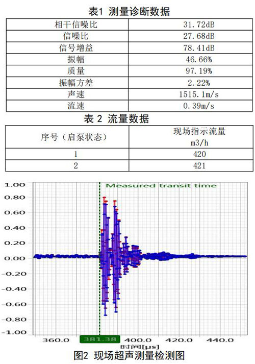 在高負荷段采用泵送補給水狀態(tài):測試時間 2018年10月11日,采用德國FLUEX高精度外夾式超 聲波流量計作為標準流量計,測量基礎數據:管道 外徑276.93mm,管壁厚度12.40mm,采用兩聲程169mm傳感器安裝距離,通過對超聲波流量計信號 分析與診斷(數據見表1、表2和圖2),診斷數據 提示標準超聲波流量計測量狀況佳,檢測開始,啟 動補給水泵,運行一段時間流量穩(wěn)定后,測量結果 如下: