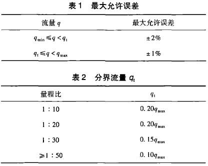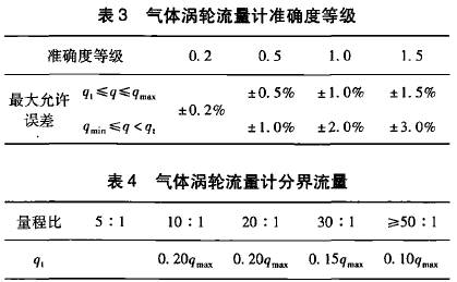 在GB21391--2008《用氣體渦輪流量計測量天然氣流量》對分界流量q,有明確的定義,即低于該流量要采用擴展誤差限的流量值。標準*5.2條從*大允許誤差和量程比兩方面對分界流量做出了規定,且明確了量程比是在*大允許誤差范圍內流量計的*小流量和*大流量之比。該標準中對渦輪流量計要求的*大允許誤差如表1所示,量程比與分界流量q,的關系如表2所示。