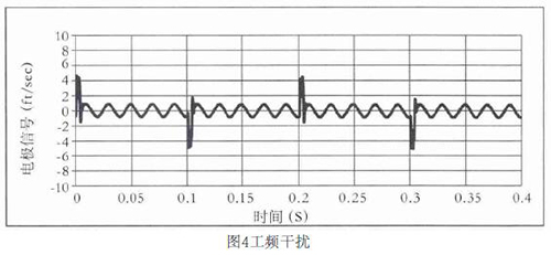 工頻干擾是硫酸管道流量計(jì)常見的干擾源。當(dāng)流量計(jì)處于電源形成電磁場中時(shí),由于分布電容的存在,以電磁波的輻射形式干擾電極信號,或者是由供電電源引入的工頻串?dāng)_,工作現(xiàn)場的工頻共模干擾,其產(chǎn)生的物理機(jī)理均是電磁感應(yīng)原理。幅度與流量信號相比,往往要大幾個(gè)數(shù)量級,頻率與供電電源頻率相同。如圖4所示,線圈驅(qū)動頻率為5Hz的電極信號,被耦合了50Hz的工頻干擾,幅度大概相當(dāng)于1feet/s。