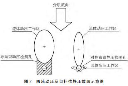 新衛(wèi)生渦輪流量計采用拋物面導(dǎo)向型結(jié)構(gòu)作為動壓測點,采用對稱自補償型式的靜壓測點,可以有效地解決來流方向偏流時信號的穩(wěn)定采集,來流偏離管道軸線時,可以維持輸出差壓基本不變,如圖2所示。