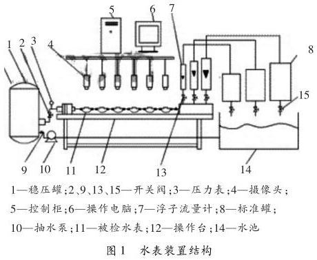 水表檢定裝置是全自動水表校驗(yàn)裝置,水表檢定裝置以計(jì)算機(jī)為核心,它在需要檢定水表上方安裝攝像裝置,連接到圖像采集和高速計(jì)算器中,計(jì)算器可以識別水表指針的流量數(shù)值,自動控制水流量,實(shí)現(xiàn)水表檢驗(yàn)的全自動化,針對水表檢定裝置存在的問題提出解決方案,減少水表檢定裝置在使用過程中出現(xiàn)質(zhì)量問題,讓水表檢定裝置可以不斷完善。