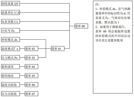 3.1、本儀表表頭采用自導引式和菜單式相結(jié)合的參數(shù)設置方式,所謂自導引式參數(shù)設置方式就是用戶在進入菜單 00 項后,表頭中的微電腦會自動導引用戶去設置需要設置的參數(shù)。另外,用戶也可以通過菜單模式分別對各組參數(shù)進行設置。蒸汽測量菜單框圖如下:
