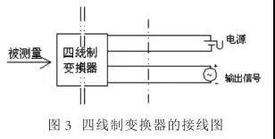 三線制變換器的接線圖如圖 2 所示,電流輸出系統(tǒng)除了兩根電流傳輸線以外,還有一根電源線向變壓器提供電源。三線制就是電源正端用一根線,信號輸出正端用一根線,電源負(fù)端和信號負(fù)端共用一根線。其供電大多為 DC 24V , 輸出信號有 DC4-20mA ,負(fù)載電阻為 250Ω 或者 DC0-10mA ,負(fù)載電阻為 0-1.5kΩ ;有的還有 mA 和 mV 信號,但負(fù)載電阻或輸入電阻,因輸出電路形式不同而數(shù)值有所不同。