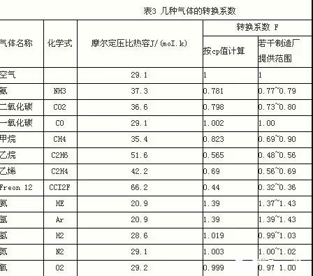 2) 不同氣體間流量換算 有些制造廠的使用說明書給出以空氣為基數的轉換系數f,可按式6換算;也可直接以標定(校準)氣體和實際使用氣體的摩爾定壓比熱按式6換算,但因還有熱導率等其他因素,換算后精度要降低些。表3給出若干氣體按摩爾定壓比熱容直接計算和若干制造廠提供的兩種轉換系數數據,其中freon12兩者差別較大。