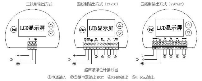 智能超聲波液位計具有三種輸出方式,在進行接線時,請按照下圖所示的接線方式進行安全接線。