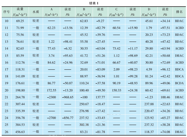 試驗(yàn)數(shù)據(jù)見(jiàn)表1,其中流量表示污水流量計(jì)60min內(nèi)的累計(jì)流量;A、B、C、D分別為4個(gè)型號(hào)的超聲波流量計(jì)在60min內(nèi)的累計(jì)流量;排名為與同一臺(tái)污水流量計(jì)比對(duì)的4臺(tái)超聲波流量計(jì)的誤差按從小到大的順序。