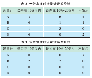 表1中,“—”表示超聲波流量計(jì)因接收信號(hào)差而不顯示累計(jì)流量,誤差>20%的超聲波流量計(jì)累計(jì)流量表示因接收信號(hào)質(zhì)量差導(dǎo)致的儀器測(cè)量錯(cuò)誤。對(duì)表1中的數(shù)據(jù)進(jìn)行分類(lèi)處理,以便得到一般和較差水質(zhì)2種情況時(shí)4臺(tái)流量計(jì)的誤差統(tǒng)計(jì)。表2和表3分別為為一般和較差水質(zhì)時(shí)的流量計(jì)誤差統(tǒng)計(jì)。
