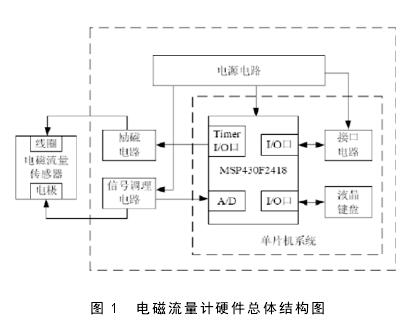 新型固井電磁泥漿流量計的硬件部分是由電源電路、傳感器、信號采集處理電路、勵磁電路以及接口電路共同組成。如圖 1 所示,為電磁流量計硬件總體結構。