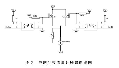 圖中的勵磁電路工作內容是控制儀表的工作磁場。其作用原理為 :單片機 MSP430F2418 定時器產生了雙頻矩形波,并經光耦隔離后與兩片場效應管組成了開關電路,從而實現了泥漿流量計使用的通斷功能。另一個電路 DH902 是恒流管,其為設備使用提供恒定的勵磁電流。具體來說,當 MCU 定時器的脈沖寬度調制(PWM)輸出后,經過濾波就能有效控制勵磁電流的幅值,進而產出雙頻矩形波。如圖 2 所示,為電磁泥漿流量計勵磁電路圖。