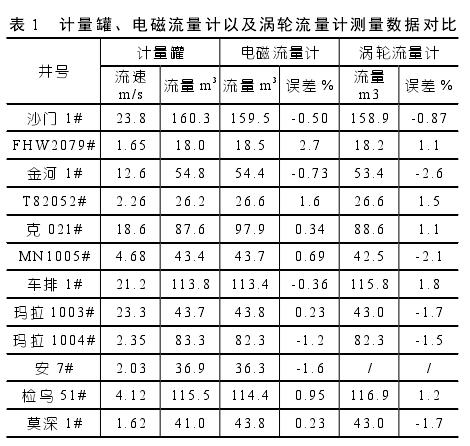 以內徑為 DN50 的電磁泥漿流量計應用固井測量過程為例,技術應用人員將高壓由壬接入泥漿管線。此過程,測量人員要將其與串接的渦輪流量計進行分析比較,以實現標準計量罐測試的準確性目標。設備應用人員將計量鉆井泥漿的密度范圍控制在 1.15~2.50 g/cm3之間,而對于固井施工現場一次性替漿量,技術人員應將其控制在 18~160 m3之間,替漿瞬時流量則應控制在 0.2~2.8 m3/min 之間。如表 1 所示,為某固井采用計量罐、電磁流量計以及渦輪流量計的數據對比。