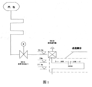 異形孔板安裝在鍋爐30米處連排管段,截去一段加裝U形管段的來流直管段上,根據安裝要求,測點位置選在距離上游直管段1810mm,距離下游直管段1085mm處。符合“距離上游直管段>10D(D=56mm,管道內徑),距離下游直管段>5D”的要求??装宓娜汗転榇怪毕蛳拢瑘A缺孔板的弦與管道橫截面水平中心線平行安裝。其改造安裝圖如圖1所示。